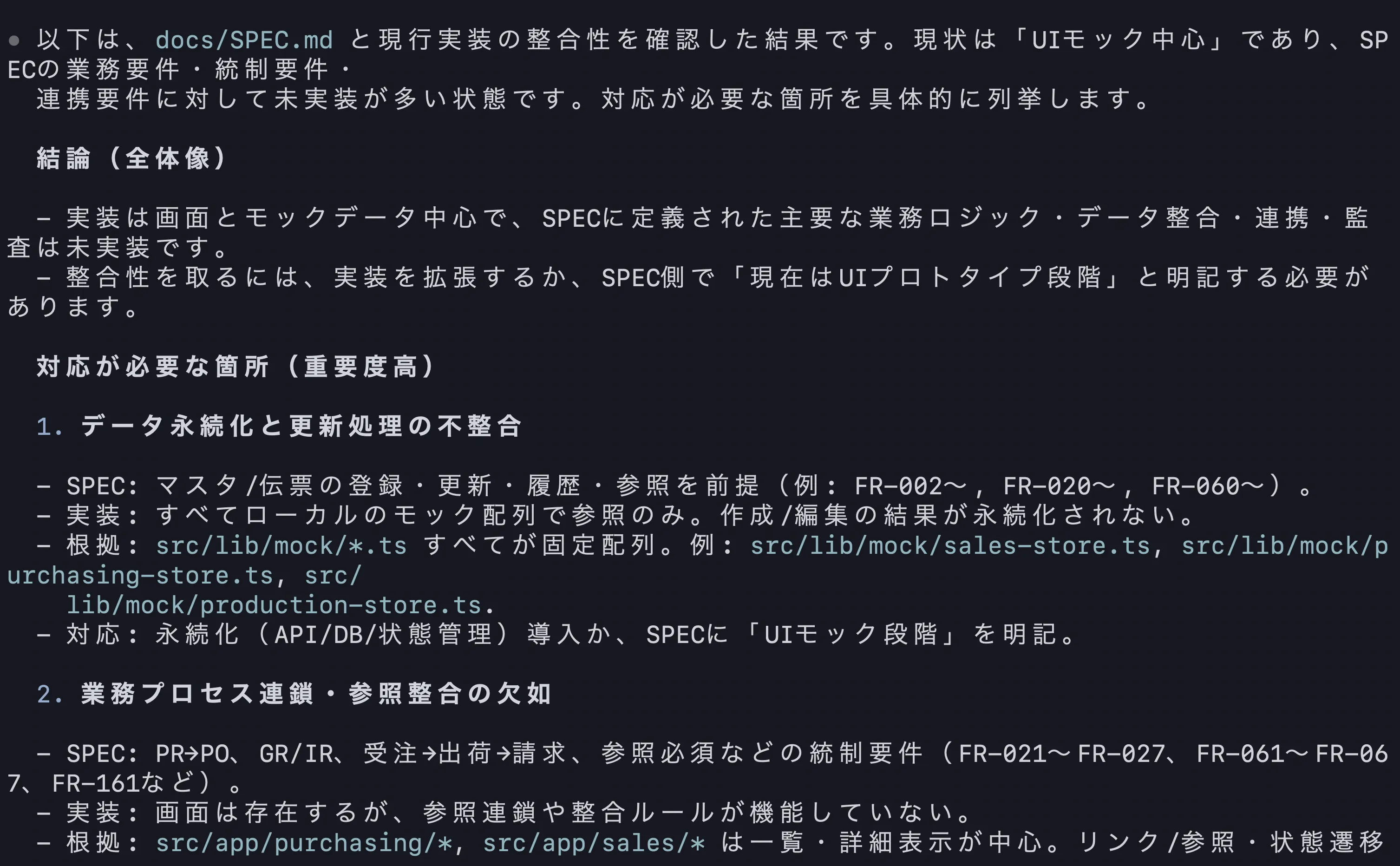 仕様把握の過程で得られた知見は、すべてMarkdownファイルとしてGit管理されます。これにより、特定の担当者の頭の中にしかない情報という状態を防ぎ、チーム全体で仕様を共有できる体制を構築できます。