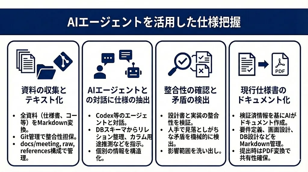 最終的に、統合・検証された情報をもとに、現行仕様書としてドキュメント化します。このドキュメント作成自体もAIエージェントに任せることで、一貫性のある形式で出力できます。
