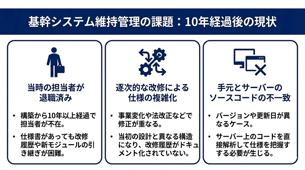 構築から10年以上経過していると、当時ベンダーとやりとりしていた担当者が退職・異動しているという事例は多く見受けられます。当初の仕様書が残っていたとしても、それ以降の改修がある場合に、詳しい仕様や新しくできたモジュールの引き継ぎができないという課題に繋がります。