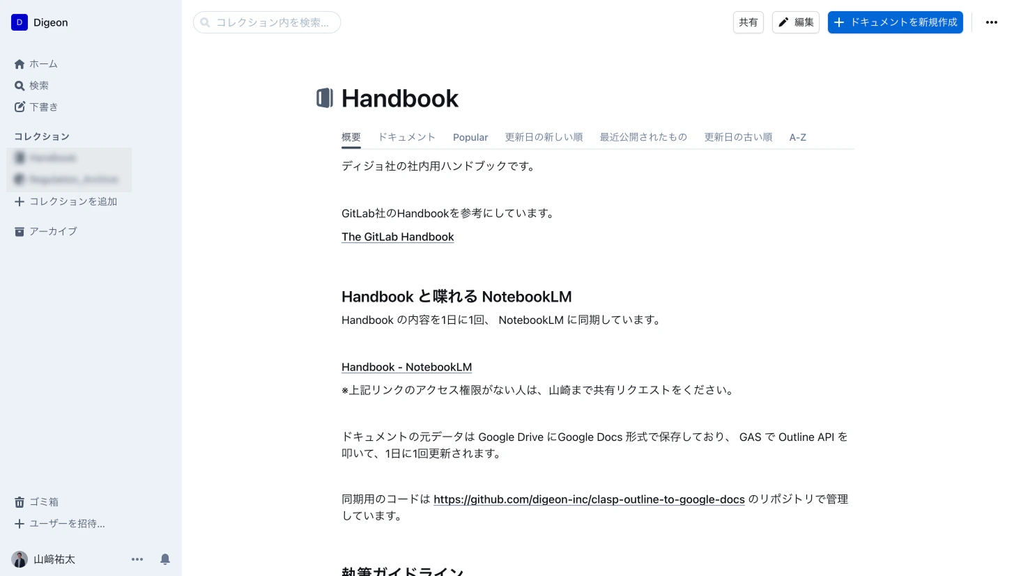 Outline で構築された Handbook を、 GAS で1日に1回 Google Drive に保存し、 NotebookLM にソースとして同期することで運用しています。